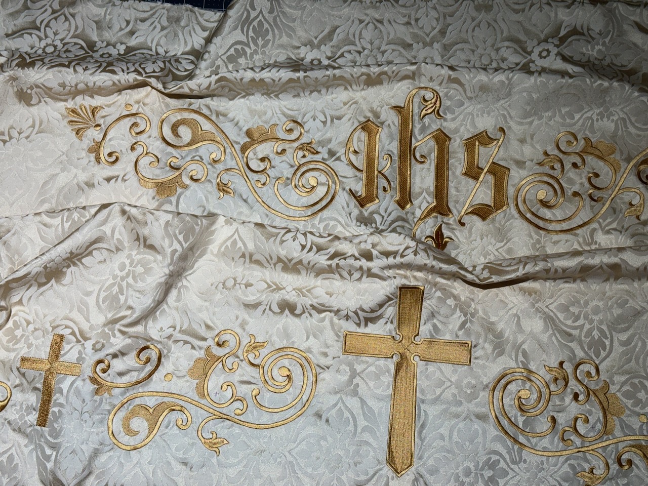 These embroidery and pattern files were created as part of a processional canopy project designed for the procession of the Blessed Sacrament during Mardi Gras. The designs are scaled for large-format embroidery on damask and similar fabrics for liturgical settings.